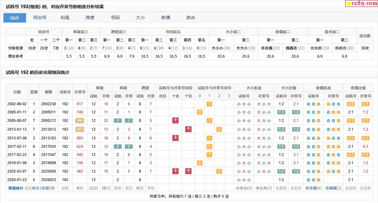 > 023期福彩3D试机号192对应开奖号的组选分析结果